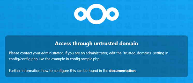 นั่นเป็นเพราะชื่อของ trusted domain (เลข IP และ โดเทนที่จดไป) ยังไม่ได้ถูกระบุใน config หลักของ Nextcloud ครับ หลังจากนี้ให้ท่าน change directory ไปที่ /var/www/nextcloud/config ด้วยคำสั่ง