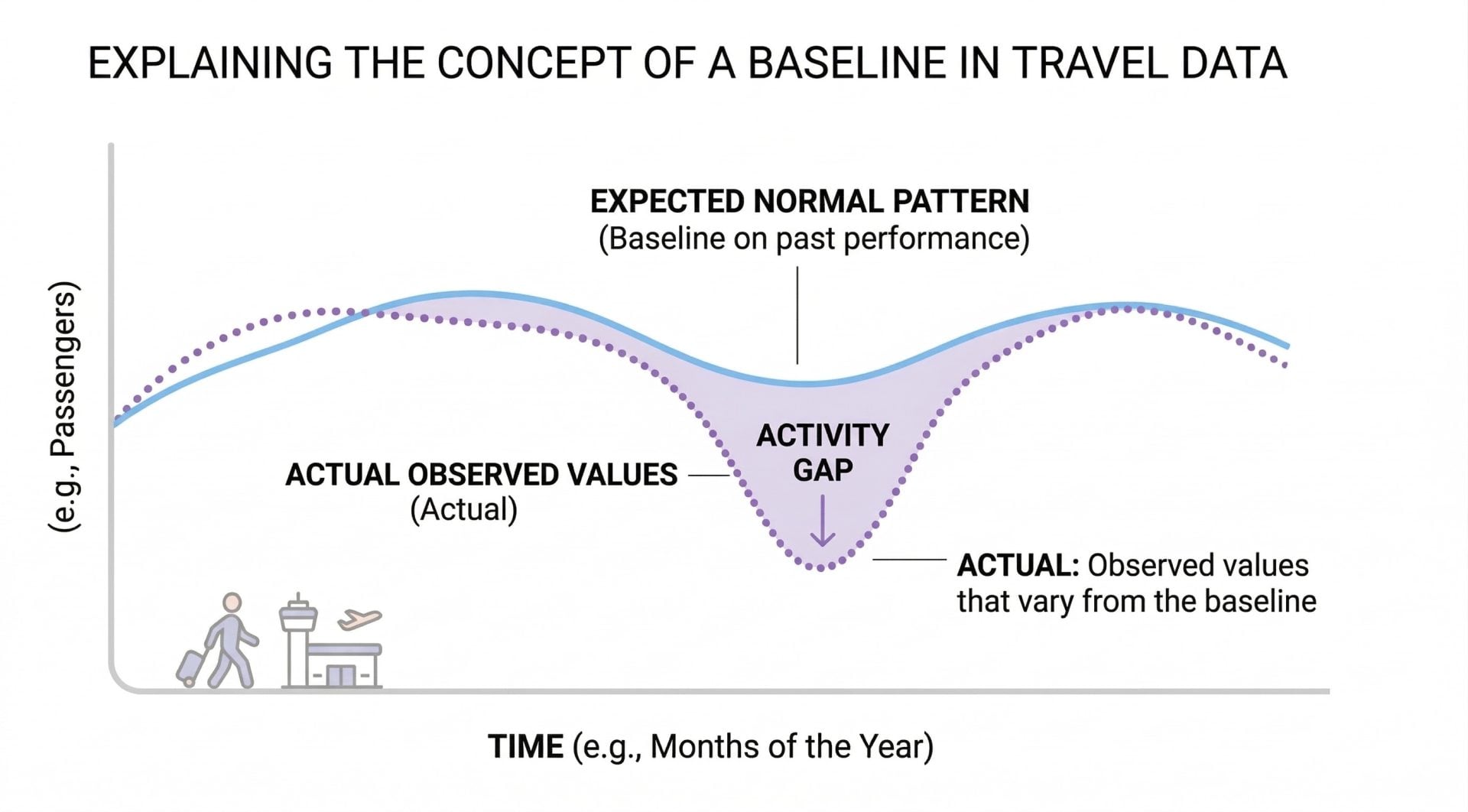 ในบทความนี้ Baseline หมายถึง ค่าพยากรณ์ของจำนวนผู้โดยสารในภาวะปกติ ซึ่งสร้างขึ้นจากโมเดลพยากรณ์ (Forecasting Model) โดยใช้ข้อมูลย้อนหลัง ก่อนนำมาเปรียบเทียบกับตัวเลขจริงที่เกิดขึ้นในช่วงเวลาศึกษา