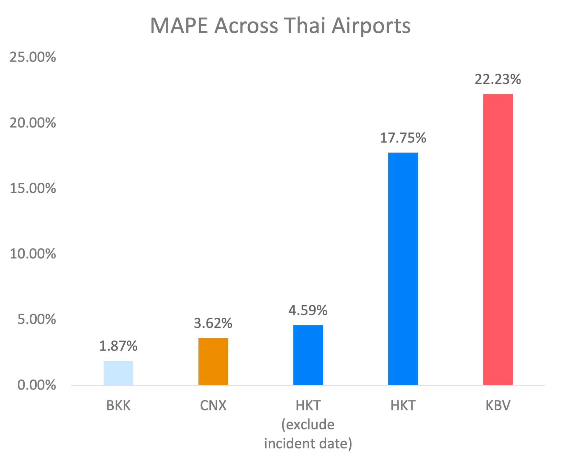 กราฟเปรียบเทียบค่า MAPE ของ BKK, CNX, HKT (ไม่รวมวันที่เกิดเหตุการณ์), HKT และ KBV โดยเรียงลำดับจากค่าต่ำไปสูง