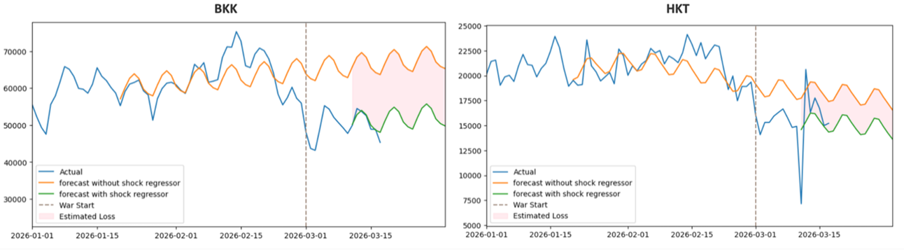 ในกรณีของ HKT แม้โดยรวมจะสามารถพยากรณ์แนวโน้มในภาวะปกติได้ดี แต่ข้อมูลได้รับผลกระทบจากเหตุการณ์เฉพาะในช่วงเวลาสั้น ๆ อย่างชัดเจน โดยเหตุการณ์เครื่องบินลงจอดกระแทกพื้นในวันที่ 11 มีนาคม 2026 ทำให้จำนวนผู้โดยสารและเที่ยวบินเบี่ยงเบนจากแนวโน้มปกติอย่างมีนัยสำคัญ เมื่อแยกช่วงเวลาดังกล่าวออก รูปแบบของข้อมูลจะกลับมาใกล้เคียงกับแนวโน้มเดิม