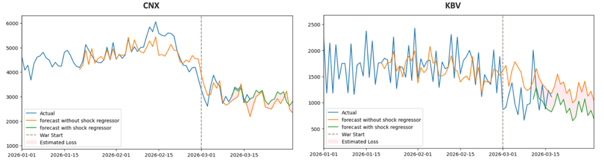 ในบริบทของงานนี้ Baseline แสดงถึงแนวโน้มของจำนวนผู้โดยสารในภาวะปกติ ขณะที่ Shock Regressor ทำหน้าที่ระบุช่วงเวลาที่ข้อมูลไม่เป็นไปตามแนวโน้มดังกล่าว เช่น ช่วงที่ได้รับผลกระทบจากความขัดแย้งในตะวันออกกลาง