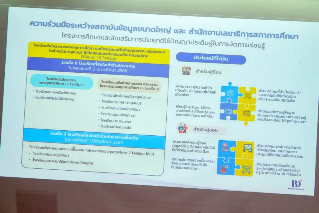 ดร.สุนทรีย์ ส่งเสริม รองผู้อำนวยการสถาบันข้อมูลขนาดใหญ่ กล่าวว่า ความท้าทายสำคัญของการพัฒนาประเทศในปัจจุบันไม่ได้จำกัดอยู่เพียงการพัฒนาเทคโนโลยี แต่คือการพัฒนาคนให้สามารถเข้าใจและใช้เทคโนโลยีได้อย่างมีคุณภาพ จากผลการประเมินสมรรถนะนักเรียนมาตรฐานสากล (Program for International Student Assessment – PISA 2022) พบว่า คะแนนคณิตศาสตร์และวิทยาศาสตร์ของนักเรียนไทยยังมีช่องว่างเมื่อเทียบกับค่าเฉลี่ยขององค์การเพื่อความร่วมมือทางเศรษฐกิจและการพัฒนา (Organisation for Economic Co-operation and Development – OECD) และในปี 2029 การประเมิน PISA จะเพิ่มการวัดทักษะด้าน AI Literacy ซึ่งสะท้อนว่าประเทศต่าง ๆ ทั่วโลกกำลังให้ความสำคัญกับการสร้างความเข้าใจ AI ตั้งแต่ระดับการศึกษาขั้นพื้นฐาน
