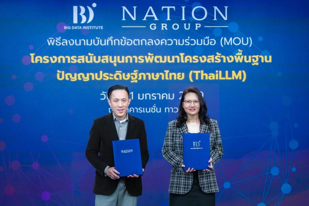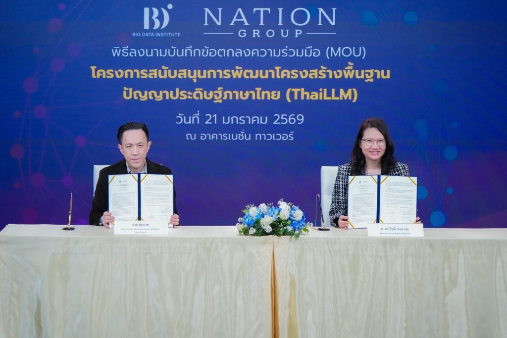 21 มกราคม 2569, กรุงเทพฯ – สถาบันข้อมูลขนาดใหญ่ (องค์การมหาชน) หรือ BDI โดย ศ. ดร.ธีรณี อจลากุล ผู้อำนวยการสถาบันข้อมูลขนาดใหญ่ พร้อมด้วย นายฉาย บุนนาค ประธานกรรมการบริหารและประธานเจ้าหน้าที่บริหาร บริษัท เนชั่น กรุ๊ป (ไทยแลนด์) จำกัด (มหาชน) หรือ NATION GROUP ร่วมลงนามบันทึกข้อตกลงความร่วมมือ (MOU) โครงการสนับสนุนการพัฒนาโครงสร้างพื้นฐานปัญญาประดิษฐ์สำหรับภาษาไทย (ThaiLLM) โดยมี ดร.สุนทรีย์ ส่งเสริม รองผู้อำนวยการสถาบันข้อมูลขนาดใหญ่ (BDI) และ นางวรางคณา กัลยาณประดิษฐ ที่ปรึกษาประธานเจ้าหน้าที่บริหาร เนชั่น กรุ๊ป พร้อมด้วยคณะผู้บริหารทั้งสองหน่วยงาน เข้าร่วมเป็นสักขีพยาน ณ อาคาร เนชั่น ทาวเวอร์