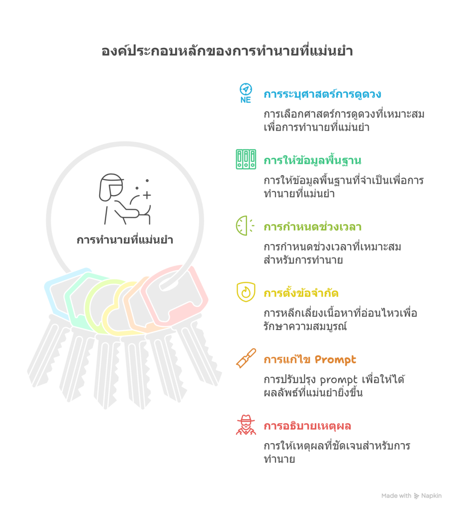 2. การให้ข้อมูลพื้นฐานที่เพียงพอ AI ต้องการข้อมูลเข้า (input) ที่เพียงพอ เช่น วันเดือนปีเกิด เวลาเกิด สถานที่เกิด หรือข้อมูลเสริม เช่น ช่วงเวลาที่สำคัญในชีวิต ถ้าป้อนข้อมูลไม่ครบ หรือคลุมเครือ AI อาจเดาและให้คำตอบผิดพลาด