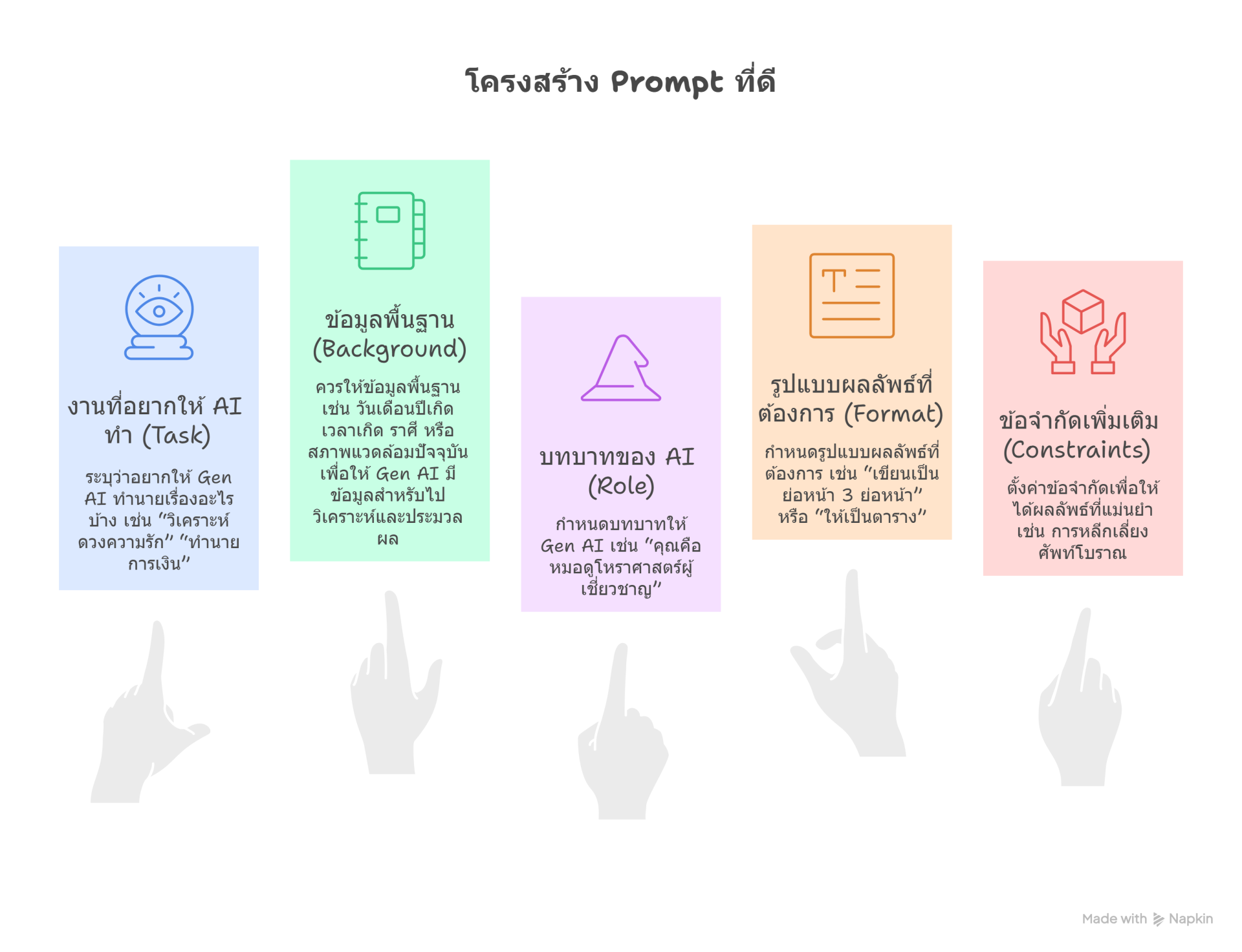 ก่อนอื่นขออธิบายความหมายของ Prompt ก่อน Prompt คือ คำสั่งหรือข้อความที่ผู้ใช้ป้อนเข้าไปให้ Gen AI เพื่อให้ AI สร้างผลลัพธ์ตามที่เราต้องการ Prompt ที่ดีจะช่วยให้ AI ตีความความต้องการของเราได้แม่นยำและตรงจุดมากขึ้น โดยทั่วไปแล้ว โครงสร้าง Prompt ที่ดีมักประกอบด้วยองค์ประกอบต่าง ๆ ดังนี้
