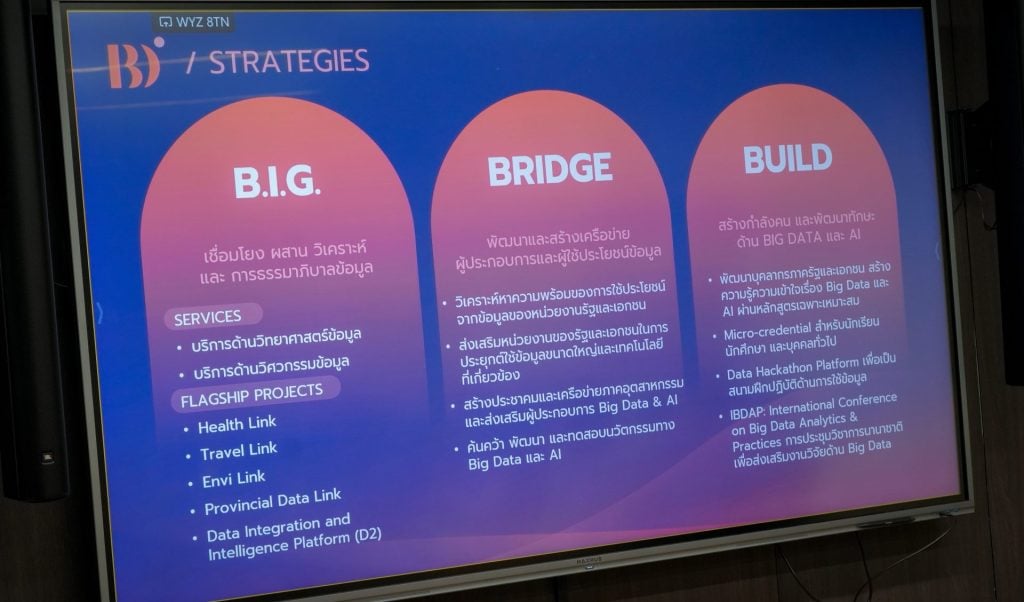 ดร.สุนทรีย์ กล่าวถึงบทบาทของ BDI ที่มุ่งเน้นให้ความสำคัญของข้อมูลเพื่อนำมาขับเคลื่อนประเทศทั้งในมิติทางเศรษฐกิจและสังคม โดยดำเนินงานภายใต้ 3 เสาหลัก คือ B.I.G.: Big Data Integration and Governance – ให้บริการด้าน Data Science และ Data Engineering, Bridge – สร้างสะพานเชื่อมระหว่างผู้สร้างเทคโนโลยีกับผู้ประกอบการ และ Build – พัฒนาบุคลากรในประเทศให้มีองค์ความรู้ด้าน Big Data และ AI เพื่อพัฒนาศักยภาพให้แข่งขันกับต่างประเทศได้ ผ่านการขยายองค์ความรู้ Big Data & AI ให้แพร่หลายทั่วประเทศ