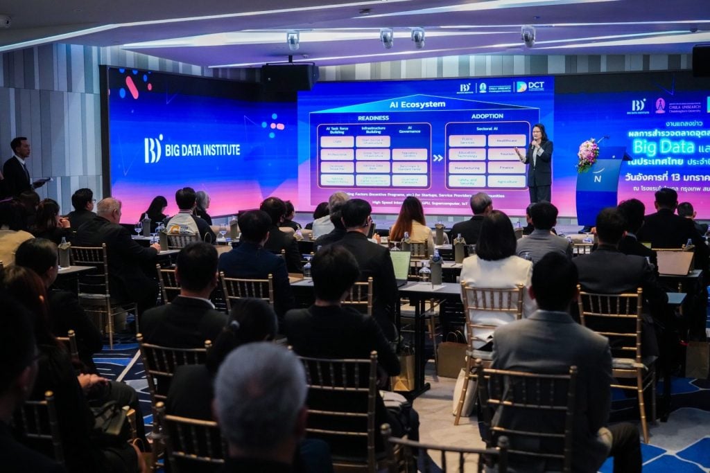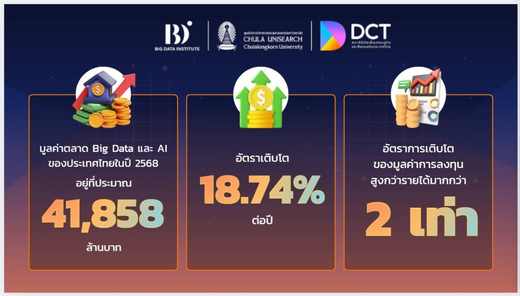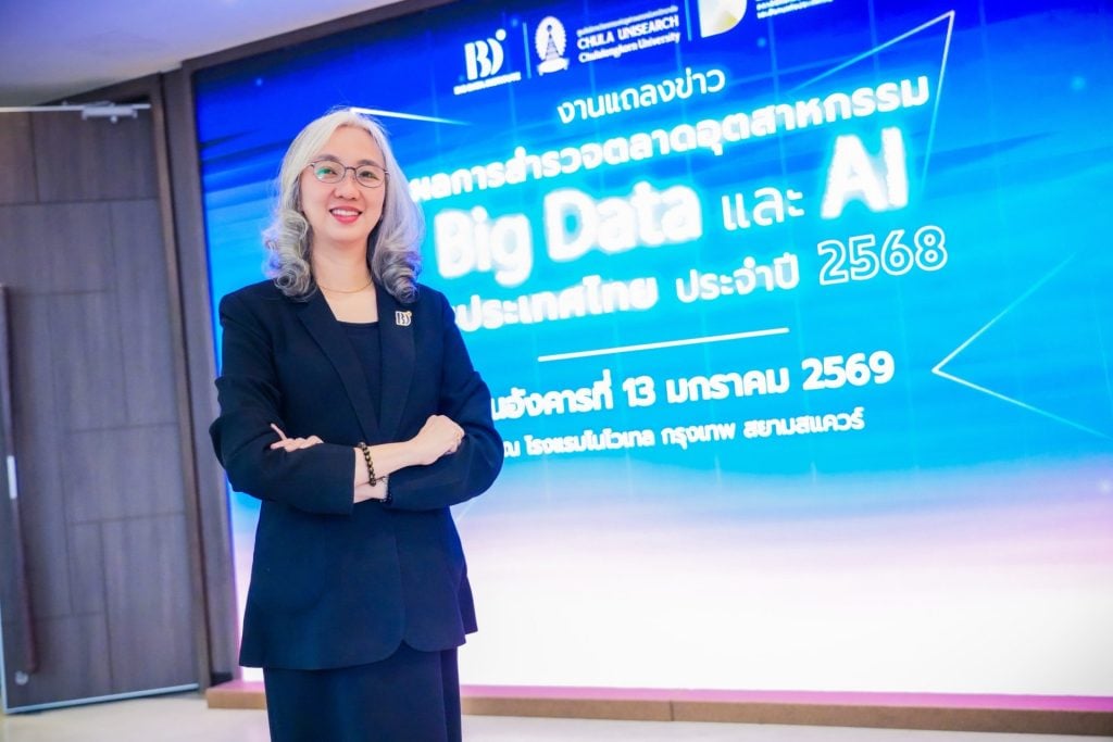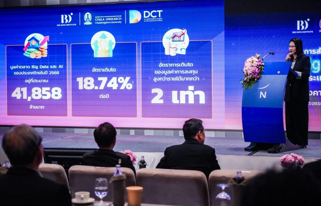 13 มกราคม 2569, กรุงเทพฯ – สถาบันข้อมูลขนาดใหญ่ (องค์การมหาชน) หรือ BDI ร่วมกับศูนย์บริการวิชาการแห่งจุฬาลงกรณ์มหาวิทยาลัย เปิดเผยผลการสำรวจตลาดอุตสาหกรรม Big Data และ AI ของประเทศไทย ประจำปี 2568 พบ มูลค่าตลาดพุ่งแตะ 41,858 ล้านบาท เติบโตต่อเนื่องจากปีก่อนหน้า 18% ขณะที่ ปัญหาขาดแคลนบุคลากรยังเป็น “วิกฤตเงียบ” ที่ต้องเร่งแก้ไข ด้าน BDI ประกาศเดินหน้าแพลตฟอร์ม D2 เปิดให้บริการเต็มรูปแบบปี 2569 พร้อมเปิดตัว ThaiLLM โมเดลใหญ่สุดภายในเดือนนี้