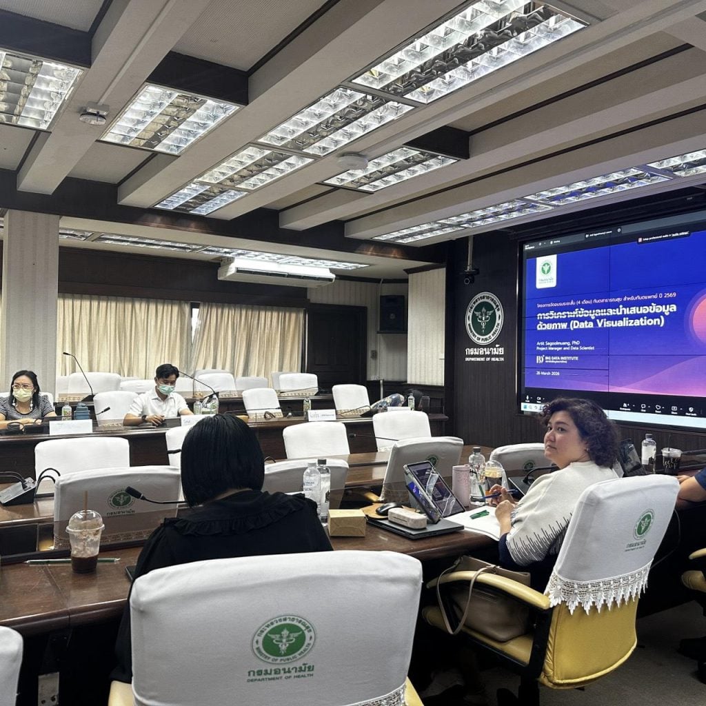 25 มีนาคม 2569, กรุงเทพฯ – สถาบันข้อมูลขนาดใหญ่ (องค์การมหาชน) หรือ BDI โดย ดร.อาทิตย์ สกุลเมือง ผู้จัดการโครงการและนักวิทยาศาสตร์ข้อมูล ฝ่ายบริการวิเคราะห์ข้อมูล ร่วมเป็นวิทยากรบรรยายในหัวข้อ “การวิเคราะห์ข้อมูลและนำเสนอข้อมูลด้วยภาพ (Data Visualization)” ให้แก่ทันตแพทย์จำนวน 15 คน ที่เข้าร่วมโครงการจัดอบรมระยะสั้น 4 เดือน ด้านทันตสาธารณสุข สำหรับทันตแพทย์ ประจำปี 2569 ณ ห้องประชุมสมบูรณ์ วัชโรทัย อาคาร 1 ชั้น 2 กรมอนามัย
